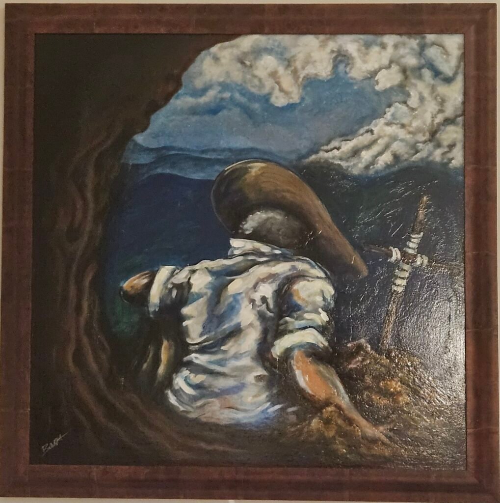 The result is a powerful and contemplative scene: Daniel Boone, rendered in Josh’s rich, expressive style, kneels at the grave of his son — a reference to the true and tragic loss Boone endured on his family’s early journey into Kentucky. The figure’s posture, the carved cross, and the sweeping sky convey sorrow, resolve, and legacy in a single frame. More than a painting, this is an act of remembrance — both of Boone’s sacrifice and of the timeless connection between land, loss, and the human spirit.